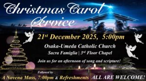クリスマス・キャロル・サービス 2025年11月08日 投稿者 Frederic Nguyen Duy 音楽と平和、そしてクリスマスのあたたかい雰囲気に包まれた午後を一緒に過ごしませんか? なじみのあるキャロルをみんなで歌い、この季節のぬくもりの中でほっと一息つきましょう。 日時:2025年12月21日(日)午後5時 場所:大阪梅田カトリック教会 サクラ・ファミリア 3階 聖堂 キャロル・サービスの後、午後7時からノヴェナ・ミサが行われます。 ミサの後にはお茶やコーヒーをご用意しています。☕🍰 お友だち、ご家族、そして初めての方も大歓迎です。 みんなで楽しいひとときを過ごしましょう!